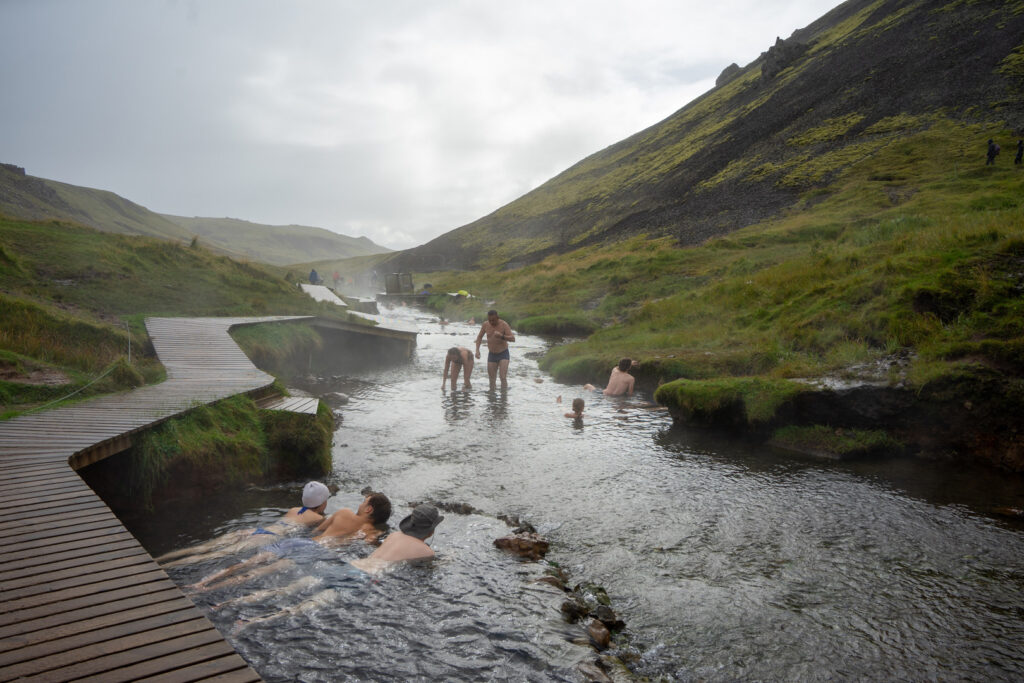 Richtig toll sind die Hotpots in der Natur. Die tollen Spots verraten die Isländer vermutlich nicht wirklich, aber dank unseres guten Reiseführers waren wir in einem kleinen Geysir-Hot-Pot (Hrunalaug) bei Fluðir; die kleinen, angenehm warmen, kaum besuchten Basalt- und Steinbecken mit Blick in die Berge waren genial; dennoch haben wir auch dort 3000 ISK pro Nase berappt. Mindestens ebenso toll war unser Bad im heißen Fluss gleich zu Beginn im Reykjadalur. Das war abgesehen von der Parkgebühr kostenlos, dafür sind wir aber auch 4 Kilometer über Berg und Tal und durch tolle Landschaft hingewandert.