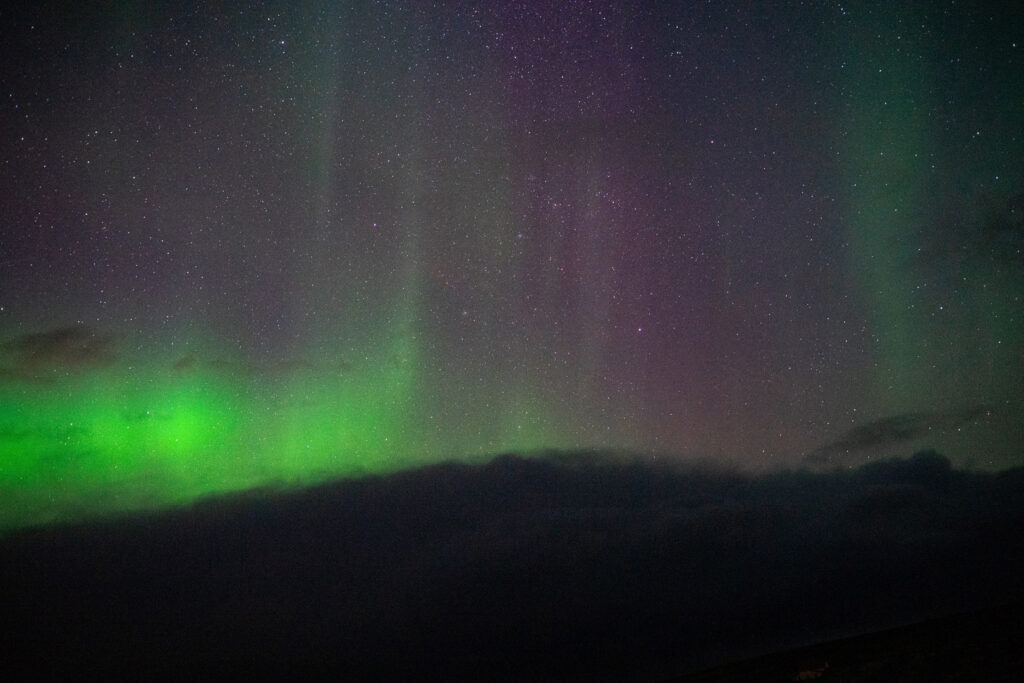Polarlichter will jeder Island-Reisende mal sehen. Doch obwohl man ziemlich nah am Polarkreis ist, ist das gar nicht so einfach. Denn es müssen drei Faktoren zusammenkommen: KP-Wert ab etwa 4 (Sonnenaktivität), Dunkelheit ohne Störlicht (Sonne, Mond, künstliche Beleuchtung) und einigermaßen wolkenloser Himmel. Im letzten Punkt liegt das Problem. Denn das Wetter ist extrem unbeständig. Dennoch hatten wir ein Mal Glück und durften Polarlichter am Himmel fluoreszieren sehen. Der Effekt ist nicht so stark wie auf den Fotos (Kameras sind hier deutlich lichtempfindlicher), aber wenn man in völliger Dunkelheit gen Sternenhimmel schaut, sieht man plötzlich Vorhänge aufscheinen, sich verändern, durch die Atmosphäre wabern. Und das ist einfach unglaublich!