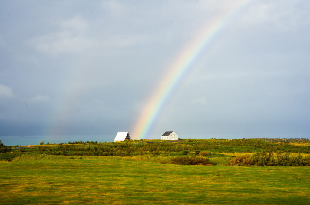 Der mit Abstand schönste Nebeneffekt des sich dauernd ändernden und sehr lokalen Wetters sind Regenbögen. Eigentlich haben wir fast täglich einen gesehen. Prächtig über dem Meer, karge Lavafelder (hraun) überspannend oder spätestens am Wasserfall (foss) des Tages. Einfach wunderschön! Kein Wunder also, dass sich die Isländer gerne einen bunten Regenbogen auf den Asphalt oder an die Hauswand malen. Überhaupt scheinen die Menschen Graffitis an den Mauern und bunte Häuser zu lieben – könnte bei der langen Dunkelheit im Winter stimmungsaufhellend wirken.